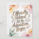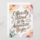 Célébrez une retraite bien méritée avec cette élégante carte de vœux à l'aquarelle présentant la citation écrite à la main “Officiellement à la retraite – Que l'aventure commence.”