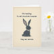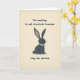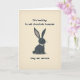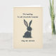 This card features a minimalist illustration of an upright, rabbit-like character in deep charcoal gray, seated neatly with long ears pointing up and a crisp white bow tie at its neck 🐰. The figure’s calm posture and slight tilt feel like it’s sharing a private joke with the viewer, adding a friendly, affectionate tone. A soft warm ivory background with a faint paper-like texture keeps the scene gentle and uncluttered. At the top, a line of black text reads, “It’s healthy to eat chocolate bunnies,” set in a typewriter-style look and centered above the character. Below the rabbit, a second centered line in matching black text finishes the gag with, “they eat carrots.” The spacing between the two lines and the character creates a balanced layout that feels tidy and easy to read, with a light spring touch 🌷. The rabbit’s dark outline contrasts clearly against the pale background, and the small white bow tie stands out as the brightest detail.