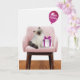 Petit chaton à poupée avec cadeau d'anniversaire et ballon de fête rose. Le texte de la bulle est modifiable.