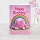 A large pink heart rests among colorful flowers beneath a bright rainbow and bright pink words that read 'Happy Birthday!'