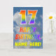Ce design amusant et coloré de carte de voeux 17ème anniversaire comprend une représentation d'un ciel bleu avec des nuages, ainsi qu'un grand nombre "17" et le message "HAPPY BANTHDAY," ayant un spectre arc-en-ciel inspiré couleur motif dégradé, sur le devant. Le recto contient également le nom personnalisé du destinataire de la carte. L'intérieur comporte un message d'anniversaire personnalisé, ou pourrait être effacé et laissé vide si un message doit être écrit à la main à la place. Une carte d'anniversaire comme celle-ci pourrait être une façon amusante d'envoyer des voeux d'anniversaire à quelqu'un qui célèbre son dix-septième anniversaire. [~Z0000371]