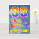 Cette carte de voeux de 33ème anniversaire amusante et colorée présente une représentation d'un ciel bleu avec des nuages, ainsi qu'un grand nombre de "33" et le message "HAPPY BANTHDAY", avec un spectre arc-en-ciel inspiré couleur motif dégradé, sur le devant. L'avant comporte également un nom de destinataire personnalisé. L'intérieur comporte un message de voeux d'anniversaire customisé, ou peut-être pourrait-il être effacé et laissé vide si un message doit être écrit à la main à la place. Une carte d’anniversaire personnalisée comme celle-ci pourrait être une façon amusante de souligner le trente-troisième anniversaire de quelqu’un. [~Z0000371]