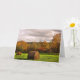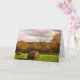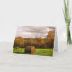 Cette carte blanche de beaux-arts présente un beau paysage d'automne dans des couleurs saisonnières de feuillage d'automne de rouge, orange, jaune, marron et vert. Une tempête est passée et le soleil traverse les nuages sur un terrain de pelouse avec des balles rondes de foin.