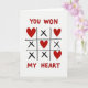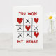 This charming greeting card turns a classic tic-tac-toe board into a sweet message about love. A hand-drawn black grid sits on a white background, with slightly uneven lines that give it a friendly, personal look. Inside the squares are four red hearts with a brushed texture and three black X’s. The hearts form a winning diagonal from the top left to the bottom right, making it feel like love has claimed the victory. Centered above the grid, the words “YOU WON” appear in bold red block letters. Below the grid, “MY HEART” is written in the same red style, completing the message in a simple, clever way. The mix of game imagery and heartfelt symbols makes this card a fun and thoughtful choice for sharing Valentine’s Day affection with someone special.❤️❤️