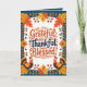 Cette charmante carte Thanksgiving encadre votre message dans un jardin animé de feuilles orange et jaune, de baies et d'accents floraux. Les mots "Grateful", "Thankful" et "Blessed" sont empilés au centre, flanqués de deux adorables dindes de dessins animés. La frontière turquoise profonde offre un contraste saisissant, tandis que le texte intérieur est entièrement personnalisable pour votre salutation personnelle de vacances.