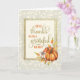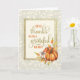 Carte de Thanksgiving avec « Remerciez Dieu avec un cœur reconnaissant » dans une police manuscrite, entourée d'une couronne de feuilles d'automne et de citrouilles. Le fond a un motif subtil de feuilles et de glands.