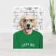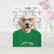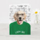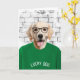 Chien d'or récupérateur en t-shirt vert et lunettes encadrées noir sur l'arrière - plan mur de brique pour les félicitations de retraite.