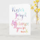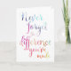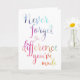 Une belle carte de retraite ou d'appréciation pour enseignants, infirmières, médecins, pasteurs, etc. Parfait comme une carte de retraite ou de remerciement. Ce grand dicton "n'oubliez jamais la différence que vous avez faite" est présenté dans une jolie typographie aquarelle. Peut être personnalisé à l'intérieur avec votre propre salutation et message.