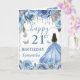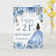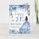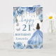 Un design pour un 21e anniversaire de couleur bleu clair et argenté mettant en vedette une belle princesse brune dans une robe de bal bleu clair fluide, entourée de roses bleues pastel, d'accents argentés scintillants et de papillons délicats. Des décorations suspendues de style cristal encadrent la composition, tandis qu'une typographie de milestone audacieuse ajoute une touche moderne et festive. La palette fraîche et aérienne, les reflets métalliques et la silhouette gracieuse de la princesse créent une esthétique luxueuse, féminine et enchanteresse parfaite pour une célébration importante.