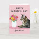 Designed with a soft rose background, the front blends a flat illustrated bouquet with a more lifelike lounging tabby cat, creating a sweet little contrast that feels like a quiet gift being offered ❤️. Across the top, “HAPPY MOTHER’S DAY” sits centered in dark, sans‑serif letters that stand out clearly against the pale backdrop. On the left, a white vase holds simplified flowers in fuchsia, yellow, orange, and light lavender, with crisp green leaves fanning outward like a cheerful hello 🌼. On the right, the striped cat stretches out in warm browns, deep gray, and black, its fur shown with fine detail that makes it look soft to the touch. The cat’s bright green eyes angle toward the bouquet, as if admiring it with a tender, slightly mischievous glance. Near the bottom, smaller dark text reads “from the cat.” and is placed low and slightly to one side, like a note added at the last second. The scene stays uncluttered, with the vase and flowers balancing the relaxed cat against the open pink space above and around them. The final touch is the cat’s curled tail and the vase’s simple silhouette set against the smooth, uniform rose background.