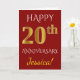Cette carte de vœux simple et personnalisée pour un anniversaire de mariage présente le message "Joyeux 20ème anniversaire de mariage", avec le "20ème" ayant une apparence dorée factice. Le devant comporte également un nom personnalisé et un fond de couleur rouge. L'intérieur contient un message de vœux personnalisé pour l'anniversaire de mariage. Elle peut être offerte à un mari ou à une femme pour célébrer le vingtième anniversaire de mariage du couple.