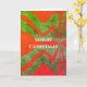 Un design de vacances insolite. En vedette est la version verticale d'un design abstrait en forme d'onde sonore en rouge vif sur un arrière - plan vert muet, qui est modelé d'une façon qui ressemble à quelque chose comme les branches des arbres de Noël. Le message "Joyeux Noël" est écrit en gras, en lettres blanches et incorporé dans le design. Sur le rabat intérieur de la carte est le graphique seul, sans mots.