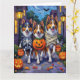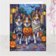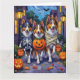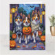 Adorable Rough Collies dressed in playful Halloween costumes carry pumpkin buckets while trick-or-treating under the moonlit sky. This festive design highlights the breed’s long flowing coat, intelligent eyes, and loyal personality, perfectly capturing the spooky yet fun atmosphere of Halloween night. A heartwarming celebration for Rough Collie lovers, dog enthusiasts, and Halloween fans alike.