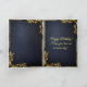 Une carte d'anniversaire en cuir bleu foncé et luxueuse, ornée d'un relief or royal gothique, d'un crâne doré menaçant flanqué d'une couronne de laurier de feuilles dorés, et enfin d'une couronne dorée, brillante d'une lumière éblouissante symbolisant un linage royal ancien. Parfait pour un anniversaire royal royal avec une touche gothique parfaite pour les amoureux de l'obscurité et gothique, sorcellerie arcane et horreur macabre.