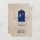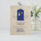 Carte de réponse Mariage boîte de police rapide et amusante avec une brillante boîte de police vintage bleue flanquée de fleurs tourbillonnantes et étoiles bleues sur un arrière - plan de papier vintage. Facile à customiser, il suffit d'ajouter les détails de votre mariage dans les champs de texte fournis. Cliquez sur "Customiser" pour trouver d'autres options de personnalisation.