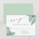 Utilisez ces cartes RSVP chic pour votre mariage d'été, de destination ou de plage. Design élégant et estival, avec des feuilles de fronde de palme tropicale en aquarelle verte, avec vos détails de mariage RSVP dans un élégant mélange de script de calligraphie, serif, et typographie italique. Cartes inversées à solide vert pâle de mer.