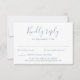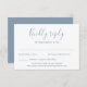 La carte de boîtier RSVP faire-part de mariage présente un design typographique élégant, moderne et propre avec un jeu de couleurs bleu poussiéreux. Cette carte de réponse est prête à vous permettre de customiser avec les détails de votre journée spéciale. Veuillez naviguer dans la suite Mariage de script moderne bleu Dusty pour trouver des articles de papeterie correspondants.