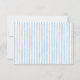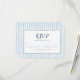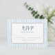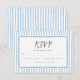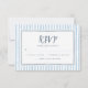 Cartes RSVP pour aller avec notre collection de mariage Rayures Rétro Bleu Fantaisiste. Ce design présente un cadre dessiné à la main bleu marine sur un fond rayé bleu clair. Il combine une calligraphie moderne et une police serif ensemble. Faites en sorte qu'il soit facile pour les invités de répondre avec cette carte RSVP classique. Une version QR plus petite est également disponible dans ma boutique, parfaite pour des réponses numériques ou rapides. Consultez la collection liée sur cette page pour l'ensemble de la papeterie de mariage. N'hésitez pas à m'envoyer un message si vous avez des questions, je serai ravie de vous aider !