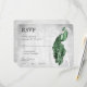 Envoyez à vos invités une carte RSVP simple et élégante Emerald Green Peacock Wedding avec votre invitation. Le design de la carte de réponse est caractérisé par un paon élégant contre un feuillage délicat et un arrière - plan grunge. Personnalisez avec la date de réponse et les choix de menu. Papier à lettres mariage supplémentaire disponible avec cette conception aussi.