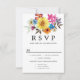 Le Rustic Summer fleur sauvage sprig orne le haut de cette jolie carte florale RSVP. Un bouquet de fleur sauvage d'été se trouve à l'arrière. Les deux ont un tournesol jaune vif au centre qui est entouré de fleurs sauvages bleus, roses, blancs et oranges brûlées. Il fait partie de la collection Summer Fleur sauvage qui contient de nombreux éléments de coordination que vous pouvez utiliser pour créer un ensemble de papeterie mariage élégant et unique.