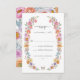 Carte RSVP florale brillante en gras. Apportez élégance et énergie à votre carte RSVP de mariage avec ce design vertical, idéal pour une fête printanière, estivale ou capricieuse d'automne. L'avant est ornée d'une gracieuse couronne de fleurs peintes à la main, dont des tourterelles roses, fuchsia, orange et jaune doré, des roses lavande, du delphinium bleu, des marguerites et des fleurs sauvages, accentuées par un papillon délicat pour une touche fantaisiste. Le motif floral assorti sur le dos complète le look avec style et charme. Faites en sorte de répondre à votre mariage aussi joyeux que la célébration elle-même - concevez votre carte RSVP parfaite aujourd'hui.