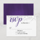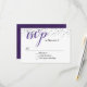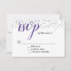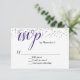 Carte RSVP de réponse mariage design moderne en blanc, sur le devant avec des graphiques de parties scintillant couleur argent et un look de feuille Ultra Violet, sur le dos. Personnalisez le champ de date de votre jour spécial.