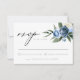 Cette carte RSVP de mariage est dotée de flores d'aquarelle bleu poussiéreux et d'une police de calligraphie élégante. Modifiez facilement le libellé de votre événement. Ce RSVP est parfait pour votre mariage ou événement de montagne, rustique, bohème ou de verdure d'hiver.