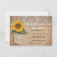 Arrière - plan en bois ancien rustique, dentelle vintage en ivoire et jarre en mason mignon avec fleur de tournesol accroché sur la petite corde - cartes de mariage parfait RSVP pour thème de mariage campagnard avec jarres en maçon et accents de tournesol.