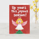 Wish someone a joyful and heartwarming holiday season with this festive Christmas card that's sure to leave a lasting impression! 🎅🏼🎄 Featuring a wide-eyed, innocent cartoon angel perched atop a Christmas tree, the contrast with the bold and explicit text ("Up yours this joyous season!") is sure to bring a laugh. The font is big and bold, making the message impossible to miss. This naughty card is perfect for spreading some unconventional holiday cheer to friends, family, or coworkers who appreciate a good laugh and a bit of dark humor. Get ready to shock and amuse with this unforgettable Christmas card!