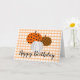 Un adorable trio de citrouilles fourrés de motifs rustiques sur un plaid en vichy orange et les mots Joyeux Anniversaire en dessous. L'intérieur dit : "Je vous souhaite une année d'abondance à venir".