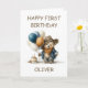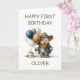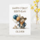 Celebrate a little one’s big milestone with this adorable rustic teddy bear 1st birthday card. Dressed in a shady hat and burnt orange scarf, the sweet bear stands beside a one-candle birthday cake while holding a bunch of balloons; perfect for delivering heartfelt birthday cheer.