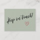 Gardez vos amis et votre famille à jour avec votre nouvelle adresse en utilisant ces cartes d'enceinte simples et élégantes. Vous pouvez les insérer dans vos envois ou les partager en personne, car vous rencontrez des personnes que vous devez avertir. Lorsque vous voulez une méthode distinctive pour faire savoir à votre tribu comment vous trouver, cette carte est suffisamment versatile pour n'importe qui. Il présente de jolis graphiques typographiques qui lisent "We've Moved" sur le devant et "Keep in touch!" sur le dos, en utilisant une police de script moderne, décontractée, manuscrite. J'ai placé une petite illustration de maison sur le contour avant et rouge du coeur aquarelle sur le dos, en ajoutant une touche distinctive. Utilisez les champs modèle pour ajouter tous vos propres détails afin de personnaliser ce design pour votre propre usage. Si vous souhaitez modifier la jolie police sans-serif simple que j'ai utilisée pour le texte modifiable, ou si vous souhaitez déplacer des lignes ailleurs, cliquez sur le lien pour customiser la carte plus loin. Le type noir a été placé sur un arrière - plan sage modifiable ; vous pouvez changer l'arrière - plan en n'importe quelle couleur. // 90 // Conçu par Melody Watson pour Paper Muserie.