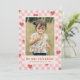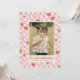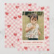 Une carte festive de la Saint-Valentin aux coeurs rouges éparpillée sur un damier rose. Le message et l'information du client sont placés sous une grande photo, et le dos de la carte comporte un motif de coordination.