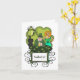 Salut ! "Bravo" ou "à votre santé" écrit en italien. Carte de voeux St. Patrick's Day avec un intérieur de pub dans différentes nuances de vert et de nombreux fleuris pour une image festive. Un couple boit de la bière dans de grandes tasses avec un homme à une table couverte de shamrock et une dame debout derrière lui. Clipart éléments grâce à Openclipart. Art, image et verse © Shoaff Ballanger Studios.