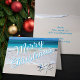 Cartes de Noël à thème de plage pliées avec texte incliné pour votre salutation personnalisée sur le devant. Deux étoiles de mer, accrochées à des ornements, décorent le coin de sable doux et tropical et de vagues sur le rivage. À l'intérieur, customisez avec un accueil et signature également imprimé sur une image de sable de plage.