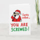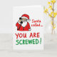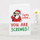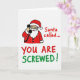 This funny card shows a cartoon Santa Claus on a white background. 🎅🏼 He's on the phone looking serious in his red suit with glasses. The words on the card say "Santa called..." in red letters. Then it says "YOU ARE SCREWED!" in big green and red letters, which is kinda unexpected but funny. 😅 It's a cool mix of traditional Christmas colors and a sassy joke. The text looks like it was drawn by hand, which gives it a friendly feel. This card is perfect for sending some holiday laughs to your friends and family! 🎄🎁