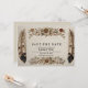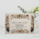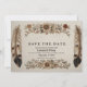 Cette image élégante est une carte de style vintage avec la phrase "SAUVEGARDER LA DATE" dans une simple police à empattements. Le texte est encadré par des illustrations détaillées et dessinées à la main de fleurs, de feuilles et de grandes plumes dans des tons terreux. La conception générale rustique et bohème est parfaite pour une invitation à un mariage ou à un événement spécial. Remplissez-la avec vos informations pour votre jour spécial.