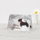 Scottish Terrier a décrit en rouge avec le texte "Joyeux Noël !" et un arrière - plan d'hiver.