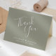 Cet élégant carte de remerciements mariage moderne présente un élégant script d'écriture manuscrite en blanc sur un arrière - plan vert sage. Ajoutez les noms du couple et la date du mariage dans la police sans serif.
