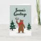 This digital illustration shows a cute brown bear with a red scarf, holding antlers in a snowy forest. The bear is in the center with two green trees covered in snow. At the top, it says "Season's Greetings" with snowflakes falling. The colors are soft and calm, making it cozy and joyful. The bear looks playful and invites us to join in the holiday fun. It feels like a warm hug from winter 🎅🏼🎄🎁. This card is perfect for spreading holiday cheer and making people smile.