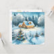 Carte de Noël personnalisée. Joli cabine festif éclairé de lumières de Noël avec un arrière - plan de beaux arbres enneigés.