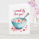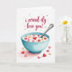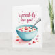 This greeting card shows a blue bowl filled with pale, creamy cereal milk and lots of heart-shaped cereal pieces in red, pink, and warm yellow. A shiny silver spoon sits in the bowl at a slight angle, like someone is about to take a bite. The background is plain white, which makes the bowl and hearts stand out nicely. A few small hearts in the same colors float around the bowl, adding a sweet, romantic feel ❤️🍫. Near the top of the card, the message reads “i cereal-sly love you!” in a flowing script style. The lettering is deep red and sits above the bowl, easy to spot and fun to read 💌.