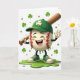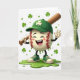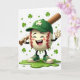 This card shows an animated baseball character centered on a bright white background, wearing a green cap with a white shamrock and matching green sneakers 💚. It grins wide with rosy cheeks and crescent eyes, lifting one hand in a friendly wave while the other rests on a wooden bat, like it’s greeting someone special in the stands. Around it, small shamrocks float in different sizes, filling the space with a light, festive St. Patrick’s Day feel ☘️. A glossy green liquid drips from beneath the ball and gathers in a puddle at its feet, adding motion and a slightly surreal touch. The baseball’s white surface and red stitching stand out sharply against all the greens, giving the character a polished, almost three‑dimensional look. The main greeting text sits above the character in green, with smaller matching text placed below near the puddle for balance. The scene is finished with scattered shamrocks framing the top corners and the green puddle shining under the sneakers.