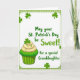 This card features a white, rounded-corner panel framed by a patterned green border, setting a cozy St. Patrick’s Day scene 💚. In the lower-left corner sits a green-striped cupcake wrapper topped with three soft swirls of vanilla-colored frosting, like a sweet treat saved for someone special. Tiny shamrock sprinkles dot each frosting peak, and a larger shamrock topper stands upright as the finishing touch ☘️. Scattered emerald shamrocks float around the panel, giving the layout the feel of a gentle shower of good luck. Across the upper and center area, the main message appears in flowing green lettering: “May your St. Patrick’s Day be Sweet!” Beneath it, in smaller green text, the line “for a special Granddaughter” sits like a quiet add-on, as if written with extra care for a close bond. The background stays bright and uncluttered, keeping attention on the cupcake, the shamrocks, and the green text within the decorative border.