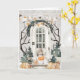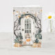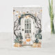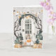 Cette amusante carte à thème Halloween dispose d'une étagère assise sur la véranda avec un tour ou régaler le citrouille dans sa bouche. La véranda est décorée pour Halloween avec des citrouilles et une bannière noire et orange. L'intérieur comporte un texte qui dit "d'abord je fais des tours, puis je reçois des friandises." Vous pouvez personnaliser avec un nom.