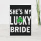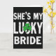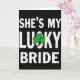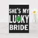 This card features a deep black background with the phrase “SHE’S MY L☘️CKY BRIDE” centered in large, uppercase white letters that look slightly worn for a vintage print feel. The words are stacked across three lines, with “SHE’S MY” on top, “LUCKY” in the middle, and “BRIDE” on the bottom, all evenly spaced and easy to read. In the middle line, the “U” in “LUCKY” is replaced by a bright emerald green shamrock, giving the design its one pop of color 💚. That little clover sits neatly in the word like a sweet wink, turning the message into a flirty, affectionate shout-out to a partner. The strong contrast between the white text and black backdrop keeps the focus on the couple-focused line, like a confident toast at a party. The shamrock’s smooth edges stand out against the slightly distressed texture of the surrounding letters, adding a touch of charm without adding extra clutter. The overall layout stays centered and balanced, with the green clover positioned exactly where the missing letter would be in the middle of “LUCKY.”