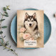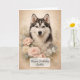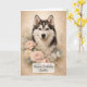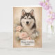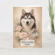 A vintage-style illustration featuring a Siberian Husky with striking blue eyes, surrounded by soft pink roses and delicate white blossoms. The composition is set against an antique-inspired textured background, highlighting the detailed fur and gentle botanical elements for a classic and elegant pet portrait.