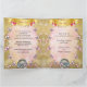Cartes faire-part de mariage uniques avec dentelle d'or, perles et anneaux d'or filetés à travers la soie d'ivoire avec un arrière - plan en or et marbre rose.