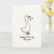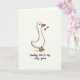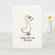 This Valentine’s Day card features a charming white goose centered on a soft off-white background. The goose is drawn with gentle black outlines, a long curved neck, a bright orange beak, and orange webbed feet that add warmth to the scene. A shiny black eye gives the character a curious, sweet expression. Two small red hearts float nearby, bringing a clear message of love. Beneath the illustration, handwritten lettering reads, “sending love to my silly goose,” in a relaxed, friendly style. The limited color palette keeps the focus on the message, making this card a heartfelt way to share affection and smiles