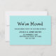 Gardez vos amis et votre famille à jour avec votre nouvelle adresse en utilisant ces cartes de boîtier simples et amusantes. Les en-têtes polyvalents lisent "We've Moved" sur le devant et "Stay in Touch!" sur le dos, en utilisant une police moderne et décontractée. Utilisez les champs modèle pour ajouter tous vos détails afin de personnaliser ce design pour votre propre usage. Le type noir a été placé sur un turquoise modifiable ; vous pouvez changer l'arrière - plan à n'importe quelle couleur que vous souhaitez. De même, les polices peuvent être modifiées si vous souhaitez modifier un peu plus la conception.